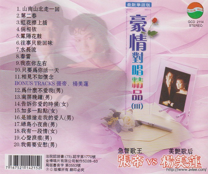 唱片名称:豪情对唱精品 3歌手名称:张帝 杨美莲发行公司:金华唱片发行编号:GCD 2114