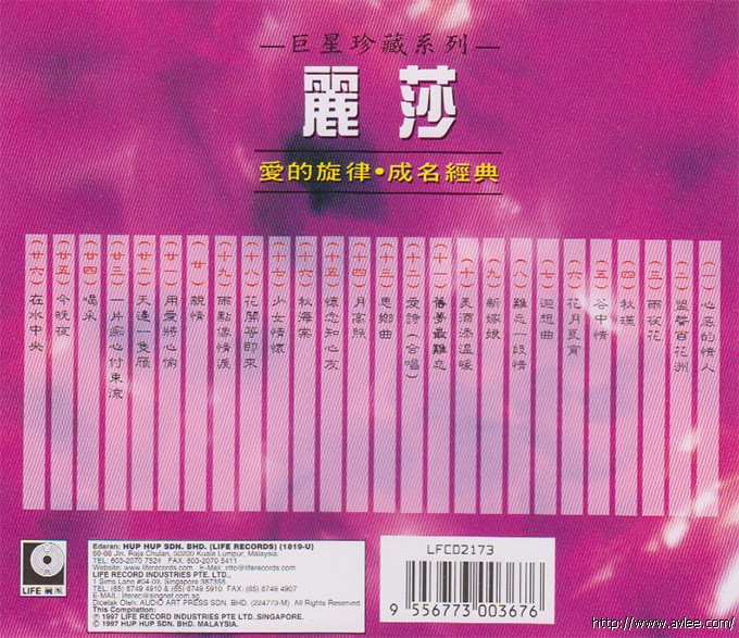 唱片名称:丽莎 巨星珍藏系列歌手名称:丽莎发行公司:LIFE发行编号:LFCD2173发行日期:1997年