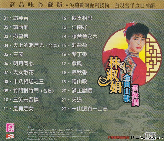 唱片名称:林淑娟 金曲山歌黄梅调歌手名称:林淑娟发行编号:FMCD 2010-2S发行日期:1990年