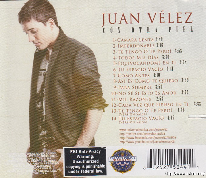 唱片名称:Con Otra Piel 歌手名称:Juan Velez 发行公司:LATINO 发行日期:2011年 唱片美图: