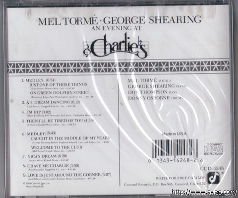 JAZZ CD名称:An Evening at Charlie's艺术家名称: Mel Tormé and George Shearing发行公司:Concord Records发行编号:CCD-4248发行日期:1990-10-25商品编号:001057