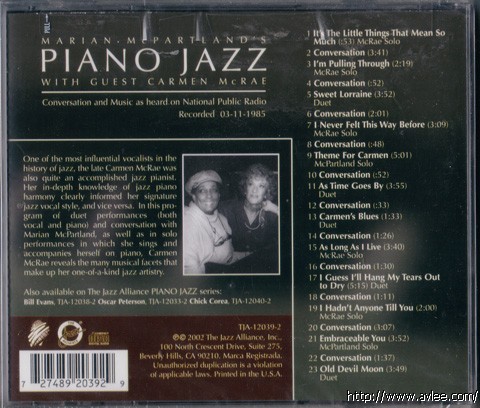 JAZZ CD名称:Marian Mcpartland's Piano Jazz 艺术家名称:Carmen Mcrae 发行公司:Jazz Alliance发行编号:TJA-12039-2发行日期:2002-08-27商品编号:001032