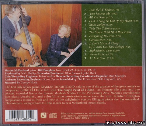 JAZZ CD名称:The Single Petal of a Rose: The Essence of Duke 艺术家名称:Marian McPartland发行公司: Concord Records发行编号:CCD-4895-2发行日期:2000-08-22商品编号:001098