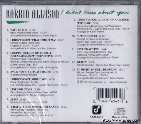 JAZZ CD名称:I Didn't Know About You 艺术家名称:Karrin Allyson发行公司:Concord Records发行编号:CCD-4543发行日期:1993-03-30商品编号:001103