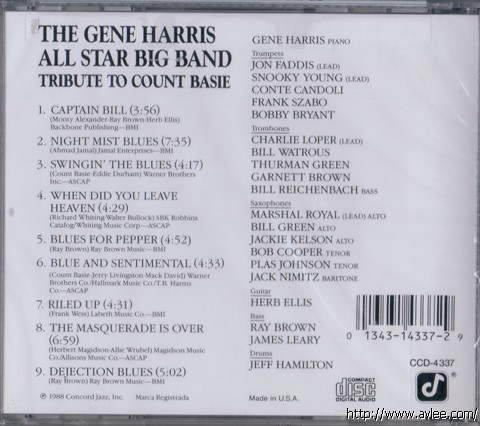 JAZZ CD名称:Tribute to Count Basie 艺术家名称:Gene Harris All Star Big Band发行公司:Concord Records发行编号:CCD-4337发行日期:1990-10-25商品编号:001165