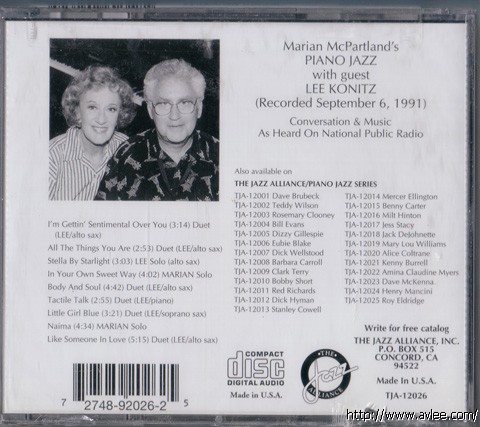 This CD has one of the most rewarding of Marian McPartland's Piano Jazz radio shows. Guest Lee Konitz proves to be a very thoughtful and sometimes witty guest. Konitz talks about what he learned from Tristano and in turn what he tries to get across to students himself. He clearly enjoys discussing the magic of improvisation. In addition, the music on this program is uniformly o... (展开全部) This CD has one of the most rewarding of Marian McPartland's Piano Jazz radio shows. Guest Lee Konitz proves to be a very thoughtful and sometimes witty guest. Konitz talks about what he learned from Tristano and in turn what he tries to get across to students himself. He clearly enjoys discussing the magic of improvisation. In addition, the music on this program is uniformly outstanding. For "All the Things You Are" the altoist coaxes McPartland to play freely without a chord structure. He takes "Stella By Starlight" unaccompanied, creates some unpredictable duets with McPartland on familiar yet still fresh standards, plays some abstract piano with the host on "Tactile Talk," and sounds beautiful on soprano during "Little Girl Blue"; upon the latter song's conclusion, Konitz admits that he had never played the song before. This CD ranks up there with the Bill Evans show as the most significant of the Piano Jazz programs thus far released on CD. ~ Scott Yanow, All Music Guide