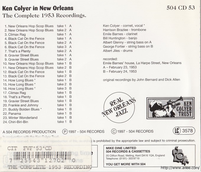 JAZZ CD名称:The Complete 1953 Recordings in New Orleans艺术家名称: Ken Colyer发行编号:504CD53发行日期:1997-11-11发行公司:504