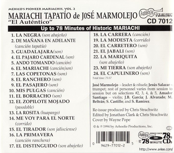 JAZZ CD名称:Mariachi Tapatio De Jose Marmolejo - Mexico's Pioneer Mariachis, Vol. 2艺术家名称: Mariachi Tapatio De Jose Marmolejo 发行编号:CD7012发行日期:1994发行公司:Arhoolie Productions