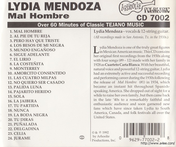 唱片曲目: 1. Mal Hombre 2. Al Pie De Tu Reja 3. Pero Hay Que Triste 4. Los Besos De Mi Negra 5. Mundo Enganoso 6. Sigue Adelante 7. El Lirio 8. La Costenita 9. Monterrey 10. Amorcito Consentido 11. Las Cuatro Milpas 12. No Quiero Ser Casado 13. Palida Luna 14. Pajarito Herido 15. Sola 16. La Jaibera 17. Tu Partida 18. Nunca 19. La Boda Negra 20. Tu Diras 21. Punalada 22. Delgadina 23. Celia 24. Jurame
