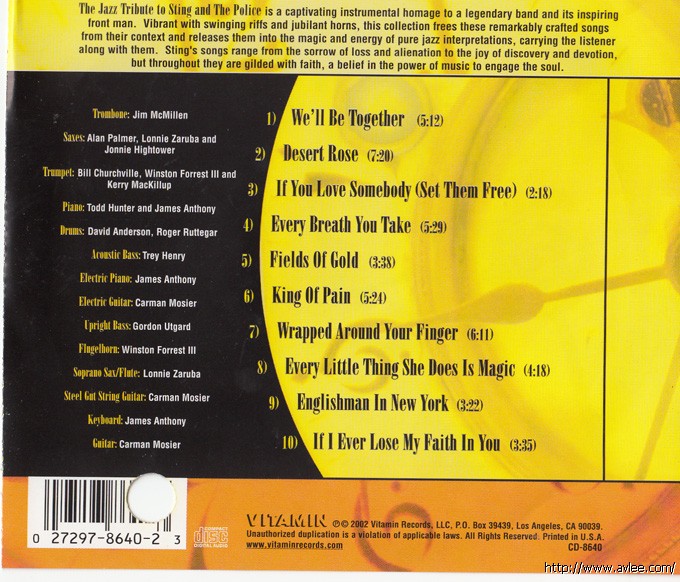 JAZZ CD名称:The Jazz Tribute to Sting and the Police艺术家名称: Various Artists发行编号:CD-8640发行日期:2002-02-26发行公司:Vitamin Records