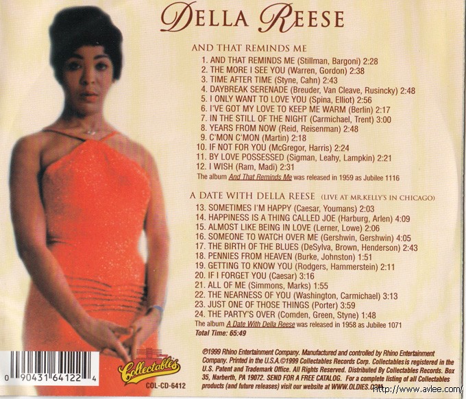 JAZZ CD名称:And That Reminds Me / Date With Della Reese 艺术家名称: Della Reese发行编号:COL-CD-6412发行日期:2000-07-11发行公司:Collectables