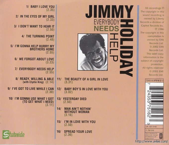 JAZZ CD名称:Everybody Needs Help 艺术家名称: Jimmy Holiday发行编号:7243 5 37516 2 3发行日期:2002-08-09发行公司:EMI Import