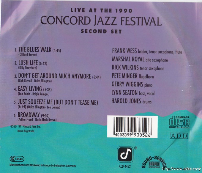 JAZZ CD名称:Concord Jazz Festival: Live 1990, Second Set艺术家名称: Various Artists发行编号:CCD-4452发行日期:1991-03发行公司:Concord Jazz