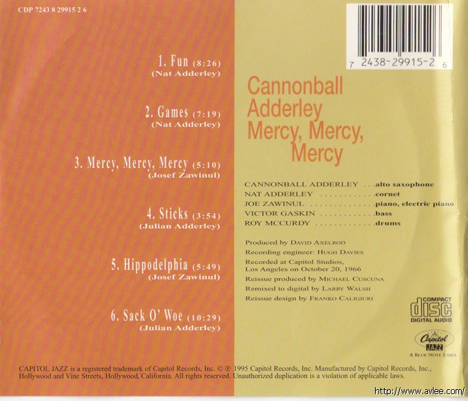 JAZZ CD名称:Mercy, Mercy, Mercy! Live at 'The Club'艺术家名称: Cannonball Adderley Quintet发行编号:CDP7243 8 29915 2 6发行日期:1995-07-03发行公司:Blue Note Records