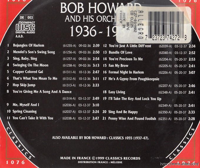 JAZZCD名称:Bob Howard 1936-1937 艺术家名称:Bob Howard发行公司:CLASSICS发行编号:1076发行日期:1999年