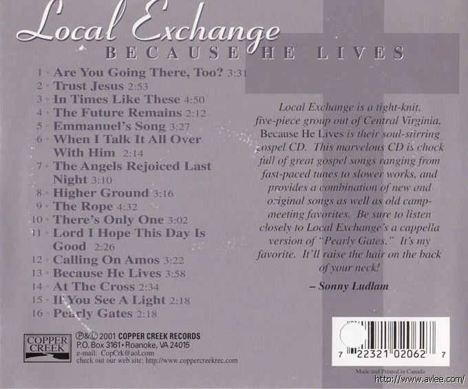 JAZZCD名称:Because He Lives 艺术家名称:Local Exchange发行公司:COPPER CREEK RECORDS发行编号:CCCD-0206发行日期:2001年
