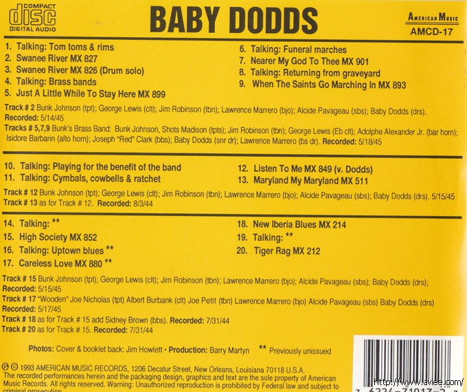 JAZZCD名称:Baby Dodds 艺术家名称:Baby Dodds发行公司:AMERICAN MUSIC 发行编号:AMCD-17发行日期:1993年