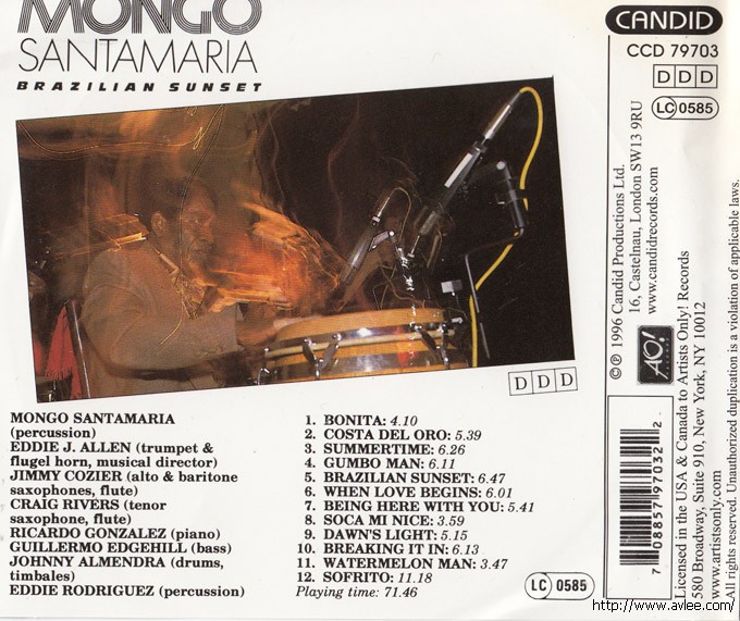 JAZZCD名称:Brazilian Sunset 艺术家名称:Mongo Santamaria发行公司:CANDID发行编号:CCD 79703发行日期:1996年
