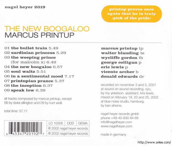 JAZZ CD名称: New Boogaloo 艺术家名称: Marcus Printup 发行编号:2019 发行日期:2001 发行公司:Nagel-Heyer Germany 唱片美图: