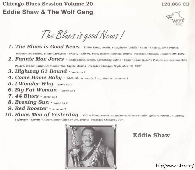 JAZZCD名称:The Blues Is Good News (Chicago Blues Session Volume 20)艺术家名称:Eddie Shaw & The Wolf Gang发行公司:Wolf发行编号:120.866 CD 发行日期:1977年