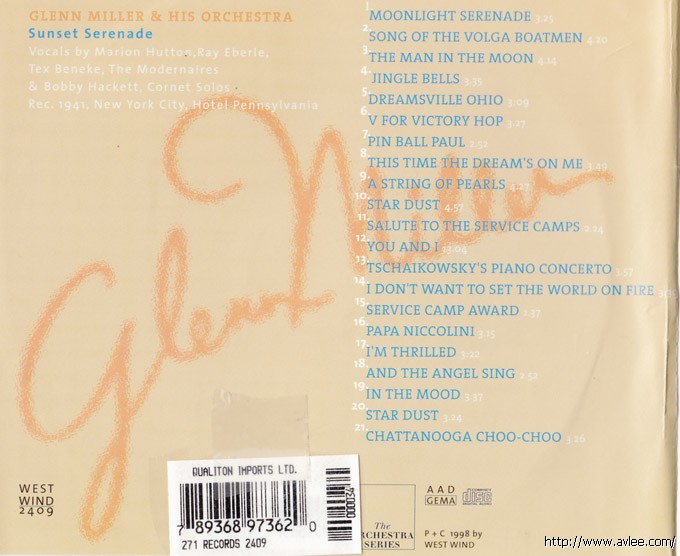 JAZZCD名称:Sunset Serenade艺术家名称:Glenn Miller & His Orchestra 发行公司:WEST WIND发行编号:2409发行日期:1998年
