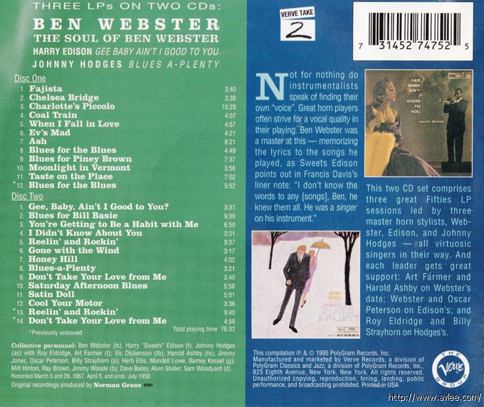 JAZZCD名称:Soul of Ben Webster 艺术家名称:Ben Webster发行公司:Verve发行编号:314 527 475-2发行日期:1995年