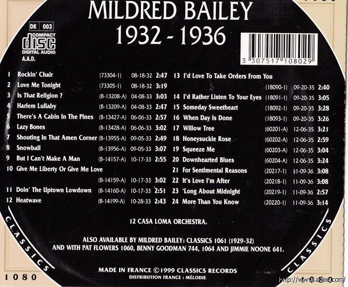 JAZZCD名称:Mildred Bailey - 1932-1936 艺术家名称:Mildred Bailey发行公司:CLASSICS发行编号:1080发行日期:1999年
