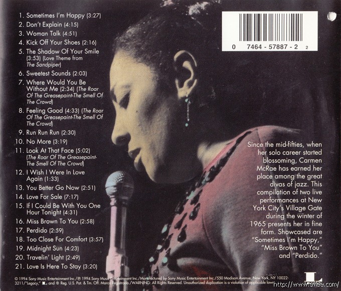 艺术家名称: Carmen McRae发行编号:JK 57887发行日期:1994-08-23发行公司:Sony