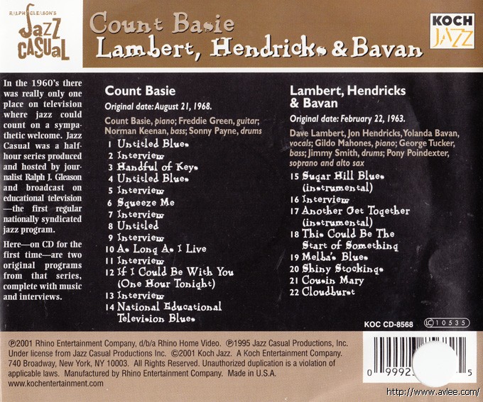 JAZZ CD名称:Jazz Casual 艺术家名称: Count Basie & Lambert, Hendricks, and Bavan发行编号:KOC CD-8568发行日期:2002-01-08发行公司:Koch Records