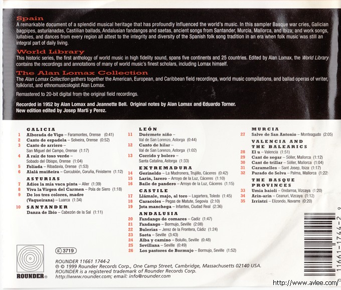 JAZZCD名称:World Library Of Folk & Primitive Music, Vol. 4: Spain艺术家名称:Alan Lomax发行公司:ROUNDER发行编号:11661 1744-2发行日期:1999年