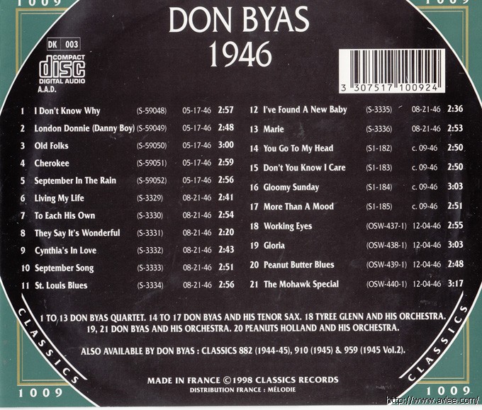 JAZZ CD名称:Don Byas 1946 艺术家名称: Don Byas发行编号:1009发行日期:2002-10-04发行公司:Classics France