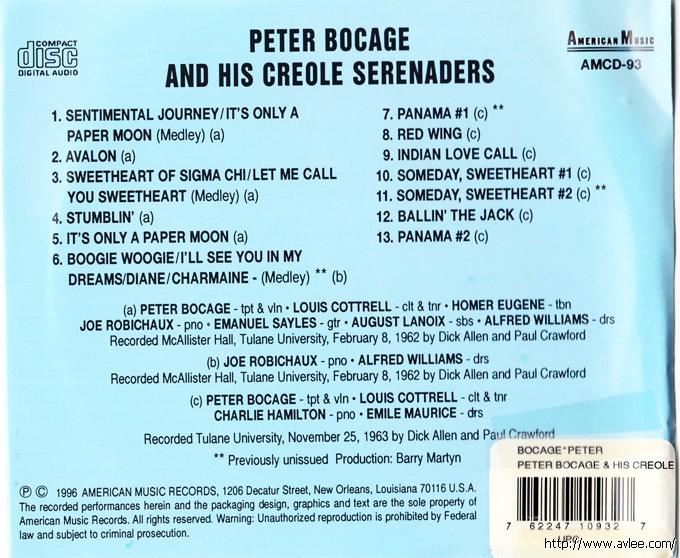 JAZZ CD名称:Peter Bocage And His Creole Serenaders 艺术家名称: Peter Bocage发行编号:AMCD-93发行日期:1996年发行公司:American Music Records
