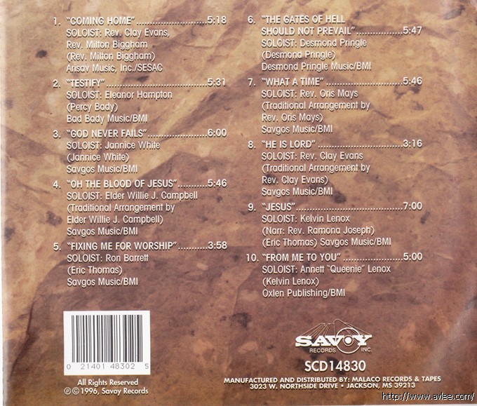 JAZZCD名称:Coming Home 艺术家名称:Rev Clay Evans & The AARC Mass Choir 发行公司:SAVOY 发行编号:SCD 14830 发行日期:1996年 唱片美图: