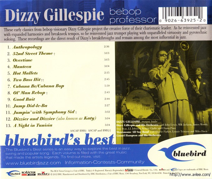 JAZZCD名称:Bebop Professor (Bluebird'S Best Series) 艺术家名称:Dizzy Gillespie 发行公司:BMG 发行编号:09026-63925-2 发行日期:2002年 唱片美图: