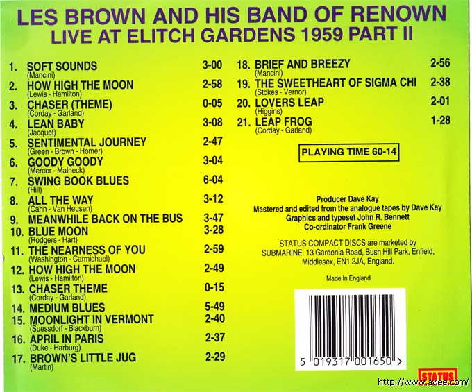 JAZZCD名称:Live At Elitch Gardens, Denver,1959 Vol.2艺术家名称:LES BROWN 发行公司:STATUS发行编号:DSTS1006发行日期:1994年