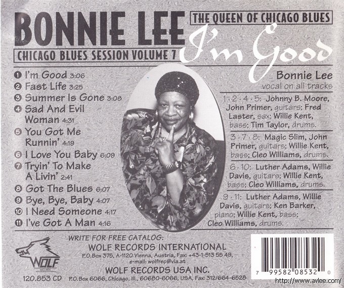 JAZZCD名称:I'm Good 艺术家名称:Bonnie Lee 发行公司:WOLF 发行编号:120.583 CD 发行日期:1998年 唱片美图: