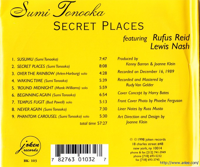 JAZZCD名称:Secret Places 艺术家名称:Sumi Tonooka 发行公司:JOKEN发行编号:BK-103发行日期:1998年