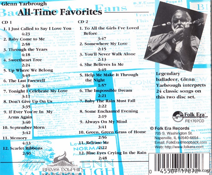 JAZZCD名称:All Time Favorites 艺术家名称:Glenn Yarbrough 发行编号:FE1707CD发行日期:1997-09发行公司:Folk Era Records