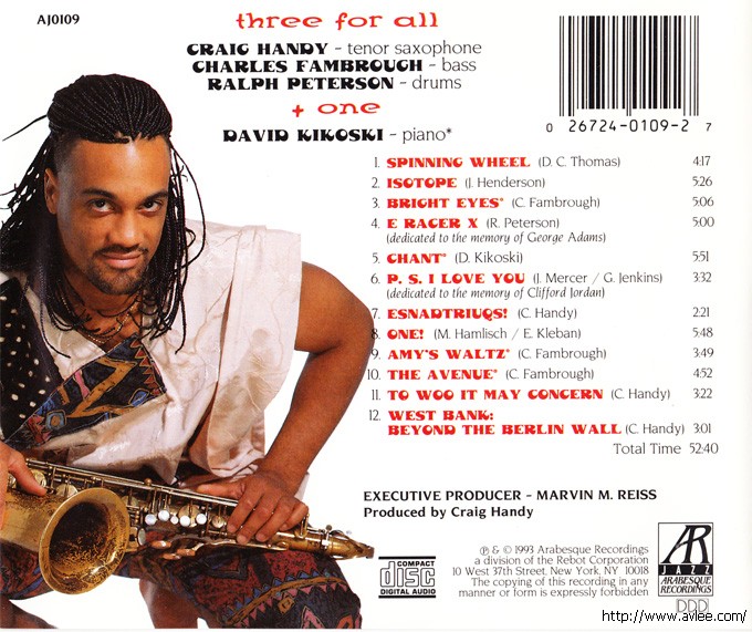 JAZZCD名称:Introducing Three For All + One 艺术家名称:Craig Handy发行编号:AJ0109发行日期:1993-10-20发行公司:Arabesque Recordings