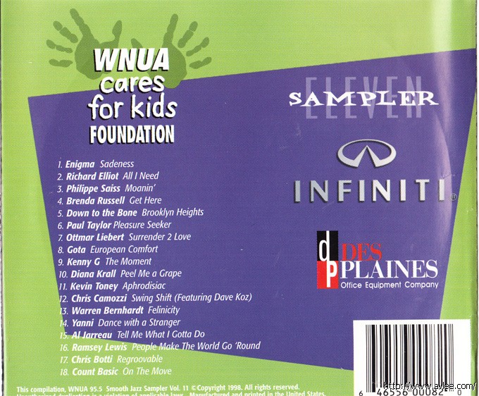 JAZZCD名称:WNUA 95.5: Smooth Jazz Sampler, Vol. 11艺术家名称: Various Artists发行公司:WNUA发行编号:0008-2发行日期:1998年