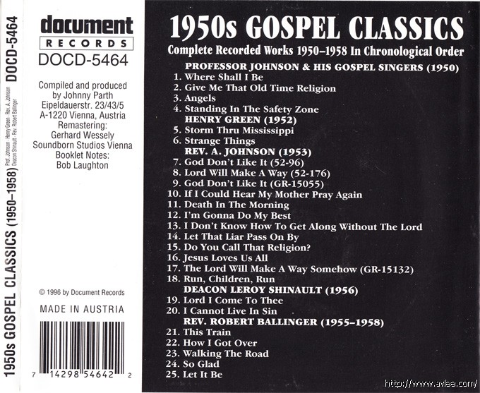 JAZZCD名称:1950s Gospel Classics 1950 - 1958艺术家名称:Various Artists 发行公司:document records发行编号:DOCD-5464发行日期:1996年