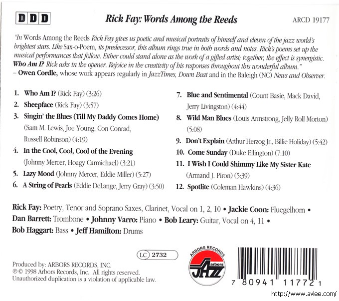 JAZZCD名称: Words Among The Reeds 艺术家名称:Rick Fay发行公司:ARBORS RECORDS发行编号:ARCD 19177发行日期:1998年