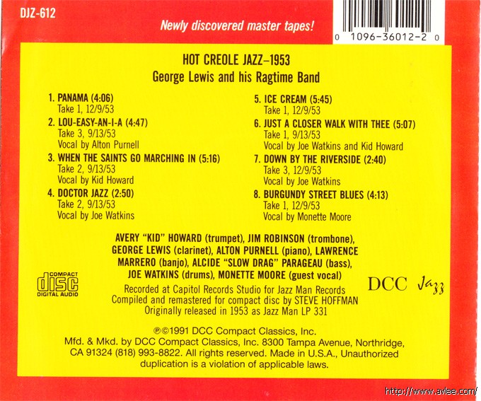 JAZZCD名称:Hot Creole Jazz - 1953 艺术家名称:George Lewis发行公司:DCC JAZZ发行编号:DJZ-612发行日期:1991年