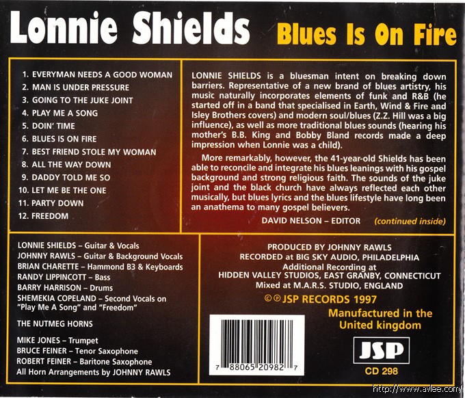 JAZZCD名称:Blues Is On Fire 艺术家名称:Lonnie Shields 发行公司:JSP RECORDS发行编号:CD 298发行日期:1997年
