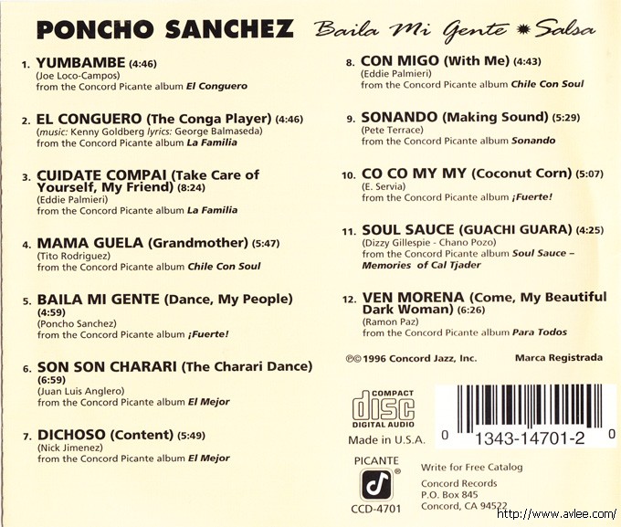 JAZZCD名称:Baila Mi Gente: Salsa! 艺术家名称:Poncho Sanchez 发行公司:CONCORD RECORDS 发行编号:CCD-4701 发行日期:1996年 唱片美图: