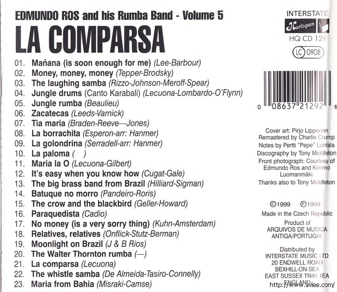 JAZZCD名称:LA COMPARSA EDMUNDO ROS AND HIS RUMBA BAND-VOL 5艺术家名称:Edmundo Ros 发行公司:HARLEQUIN发行编号:HQ CD 129发行日期:1999年