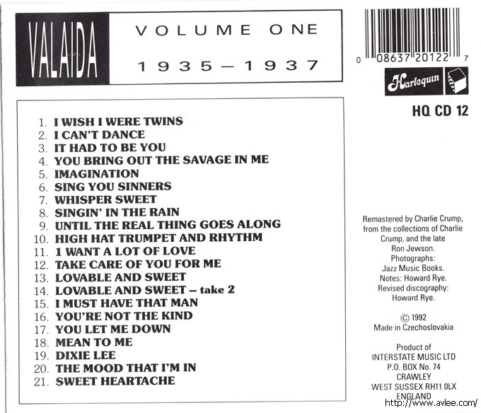 JAZZCD名称:Valaida. Volume one, 1935-1937 艺术家名称:Valaida Snow发行公司:HARLEQUIN发行编号:HQ CD 12发行日期:1992年