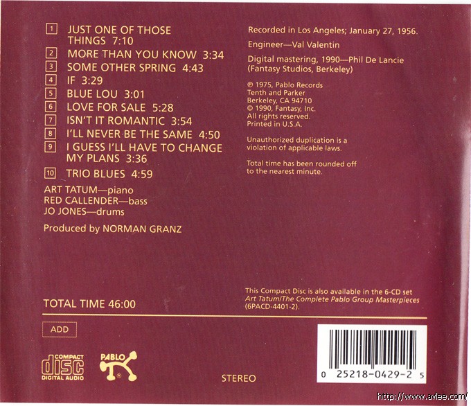 JAZZCD名称:The Tatum Group Masterpieces, Vol. 6艺术家名称:Art Tatum发行公司:PABLO发行编号:PACD-2405-429-2发行日期:1990年