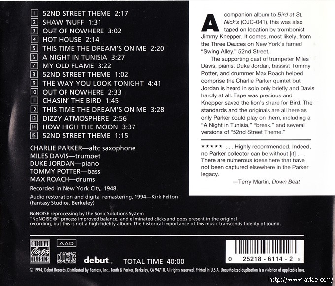 JAZZCD名称:BIRD ON 52ND STREET艺术家名称:CHARLIE PARKER 发行公司:JAZZ WORKSHOP发行编号:JCCD-114-2发行日期:1994年