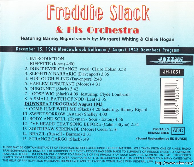 JAZZCD名称:Freddie Slack And His Orchestra艺术家名称:Freddie Slack发行公司:JAZZ HOUR发行编号:JH 1051发行日期:1998年